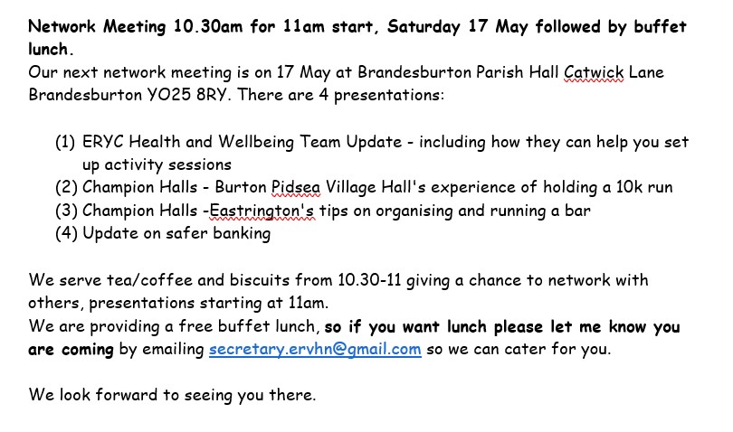 ERVHN next network meeting is on 17 th May at Brandesburton Parish Hall Catwick Lane Brandesburton YO25 8RY. Details as below.